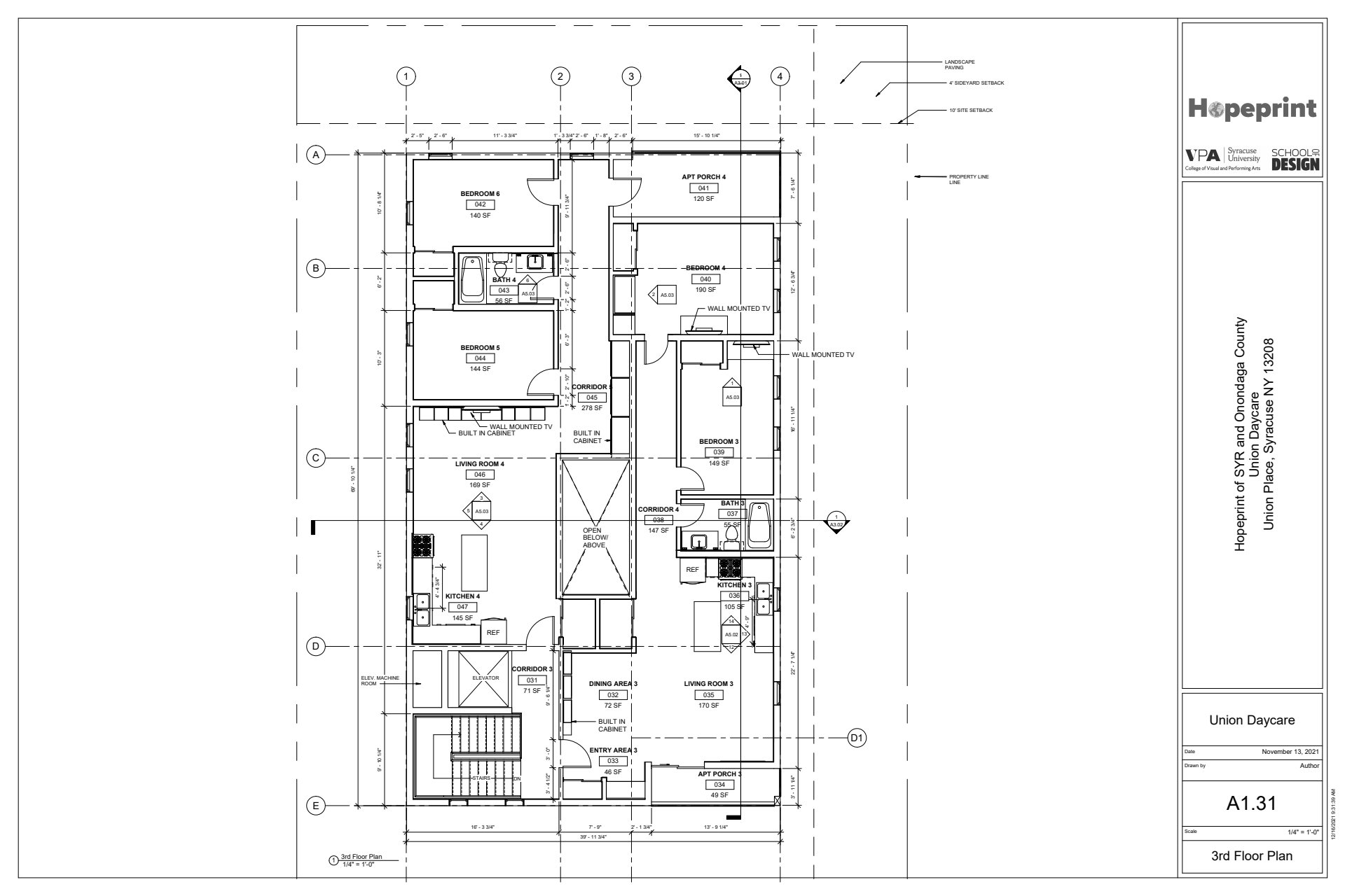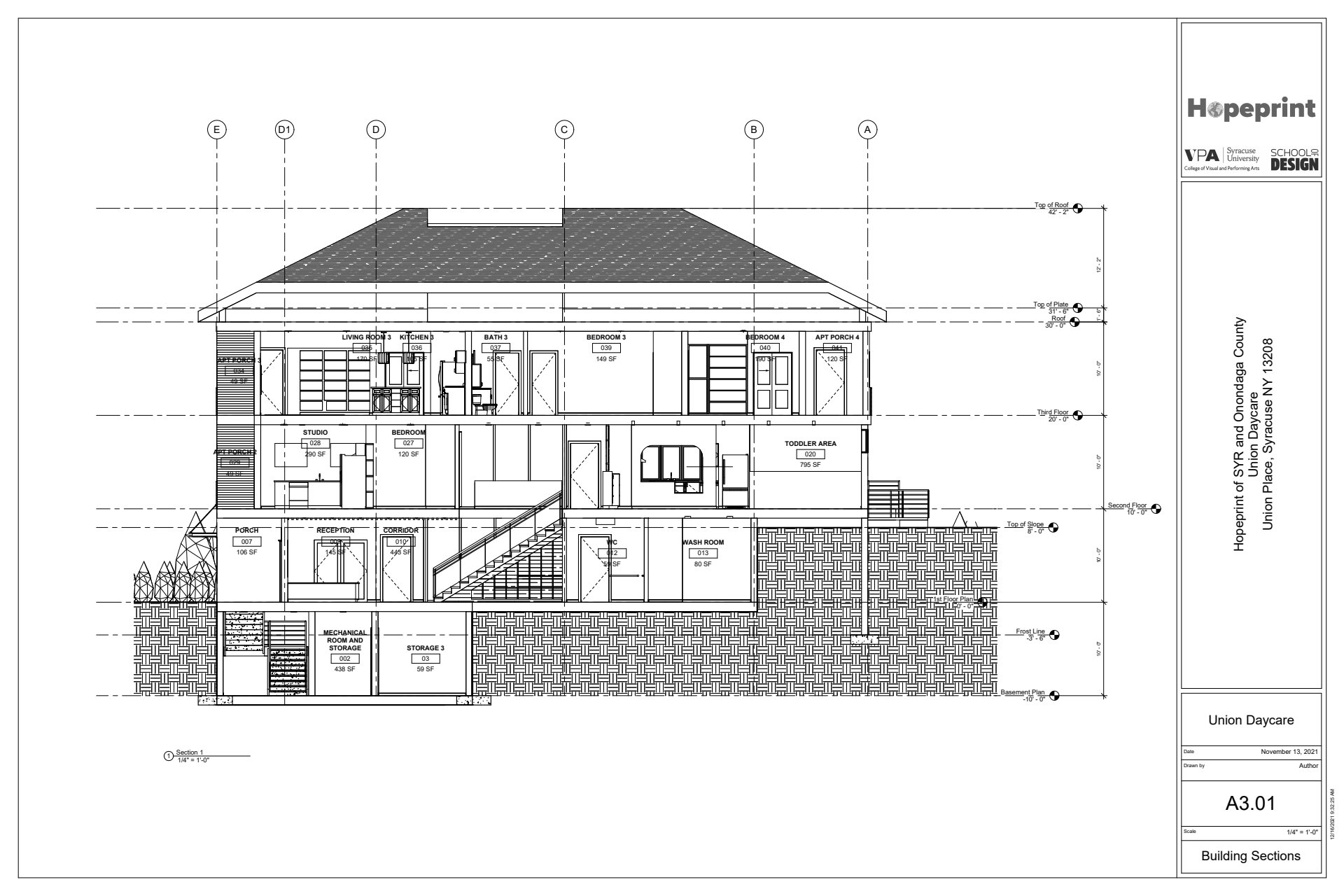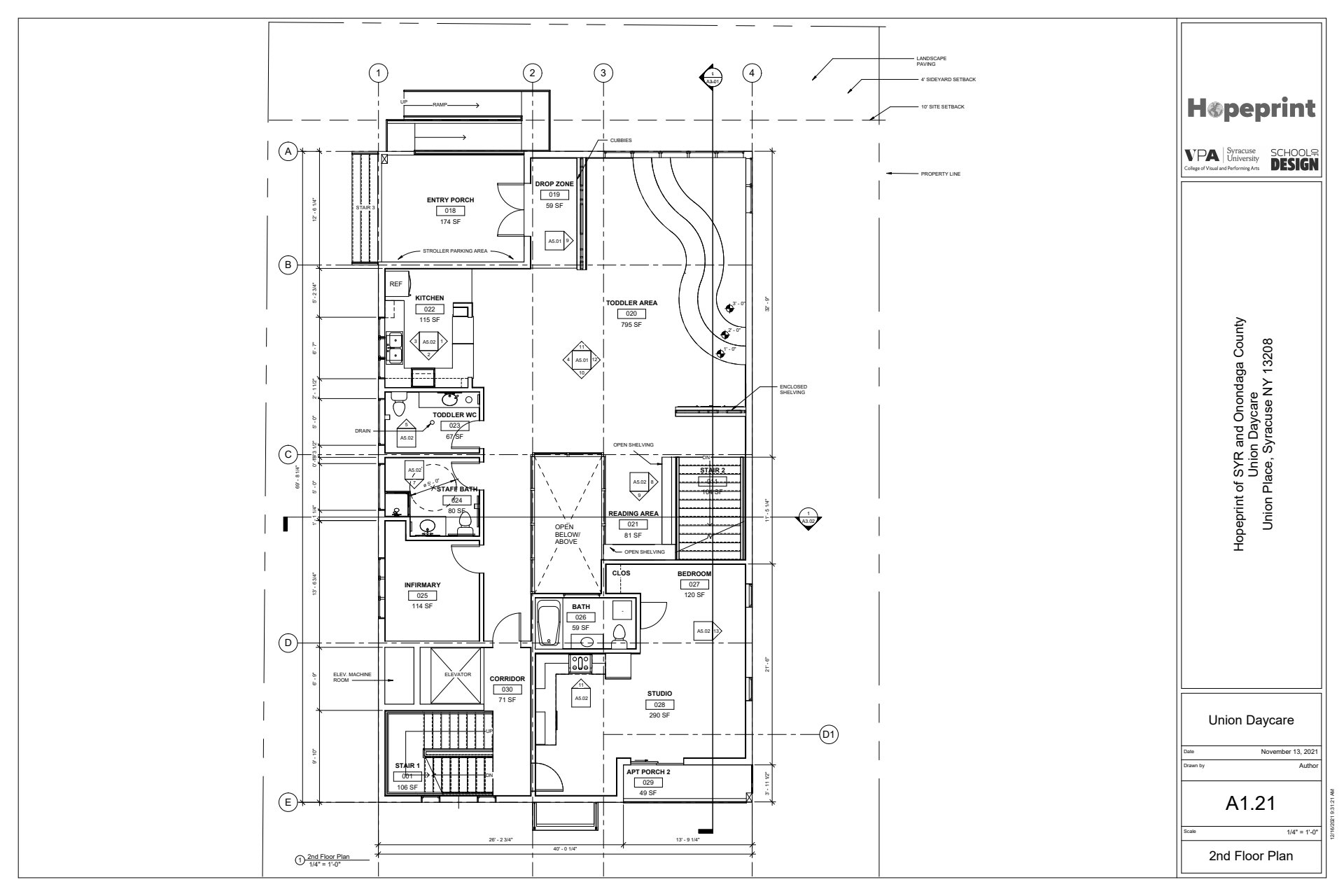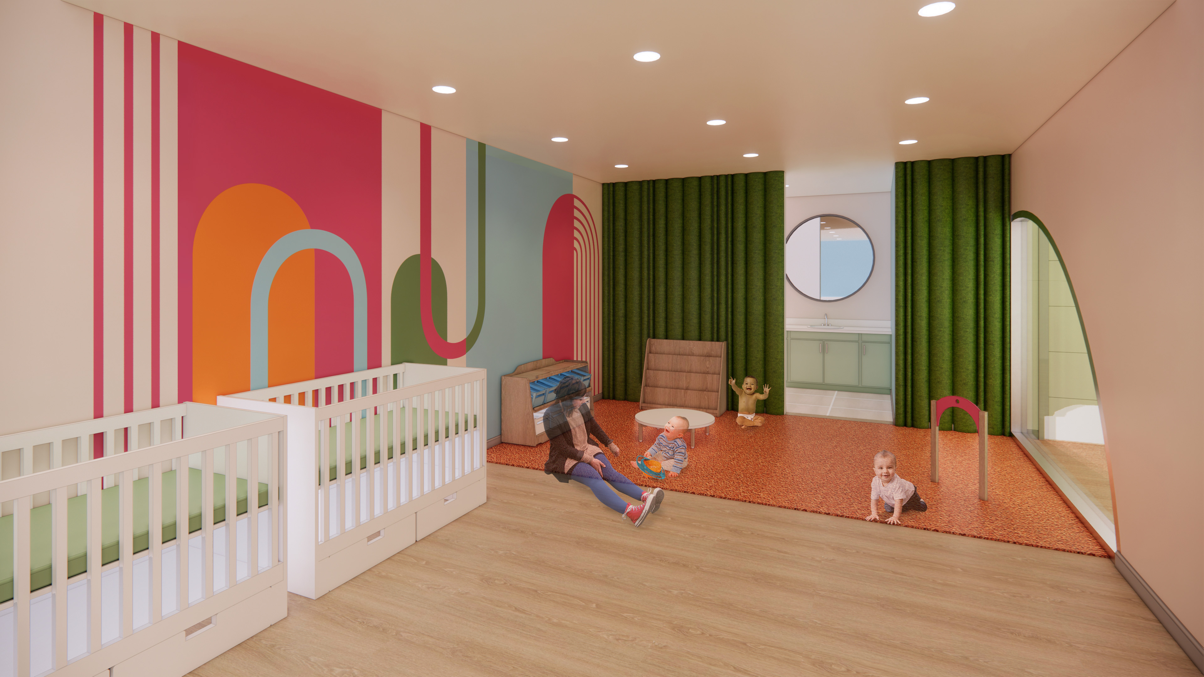 Alvord Day is part of a split occupancy building design serving two functions; the daycare is a commercial space and the apartments above are residential. The project’s client, Hopeprint, sought a space for residents of the Northside micro neighborhood to leave their children while living nearby.