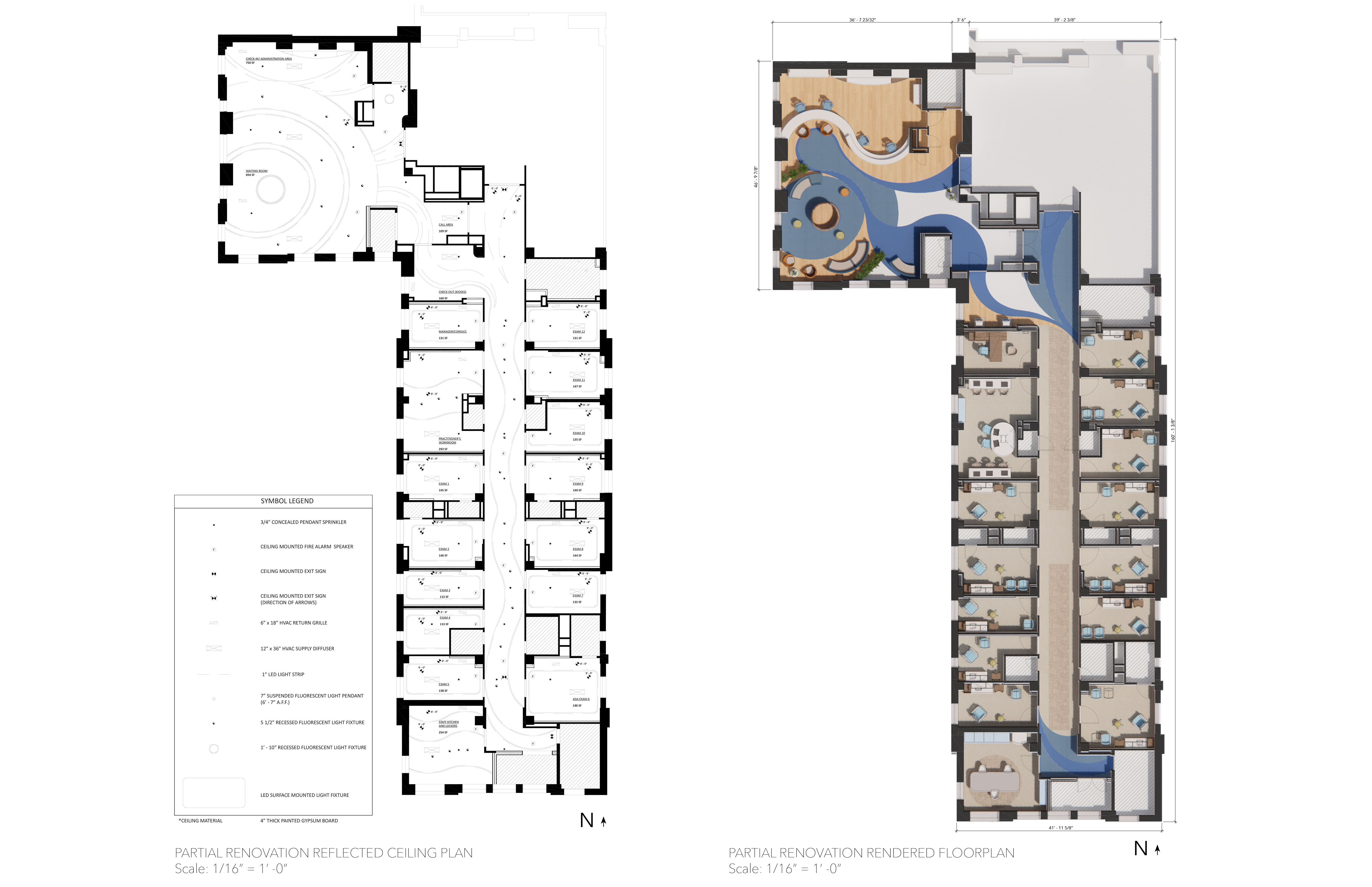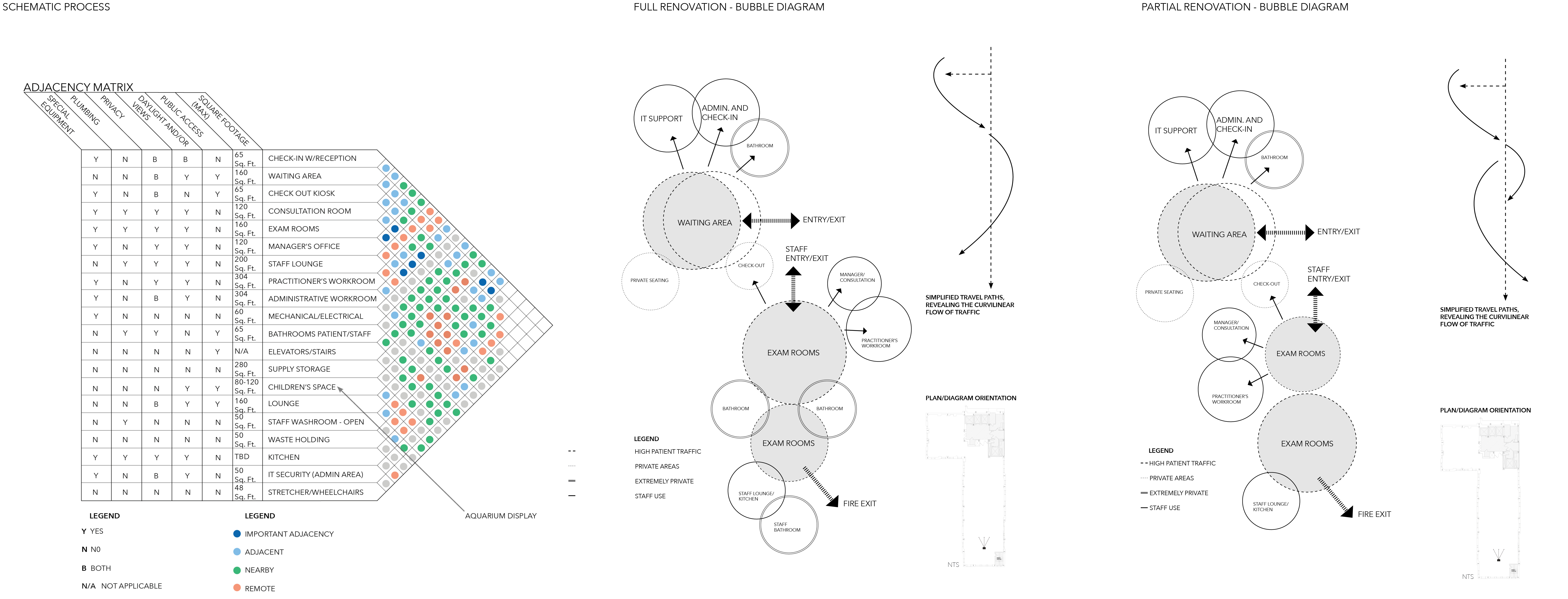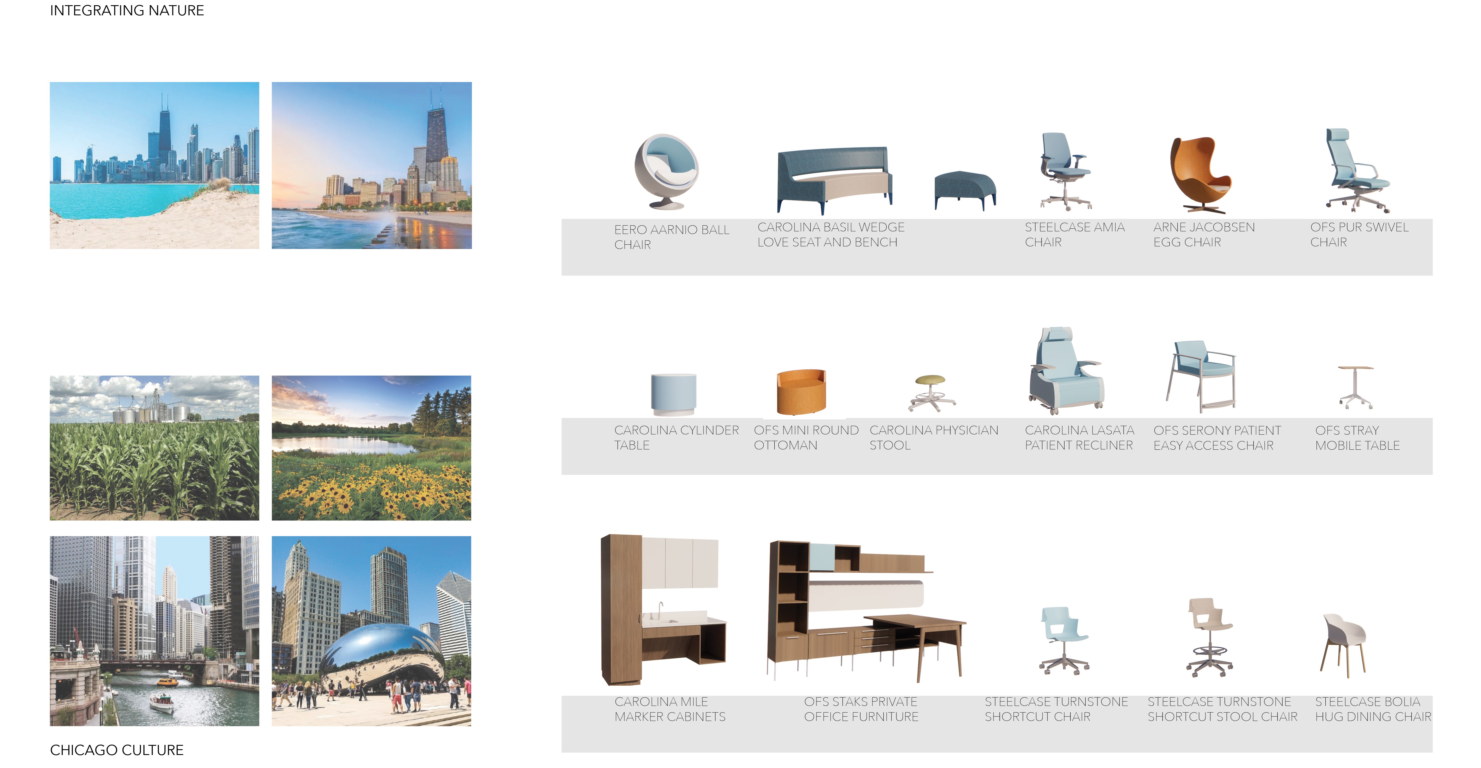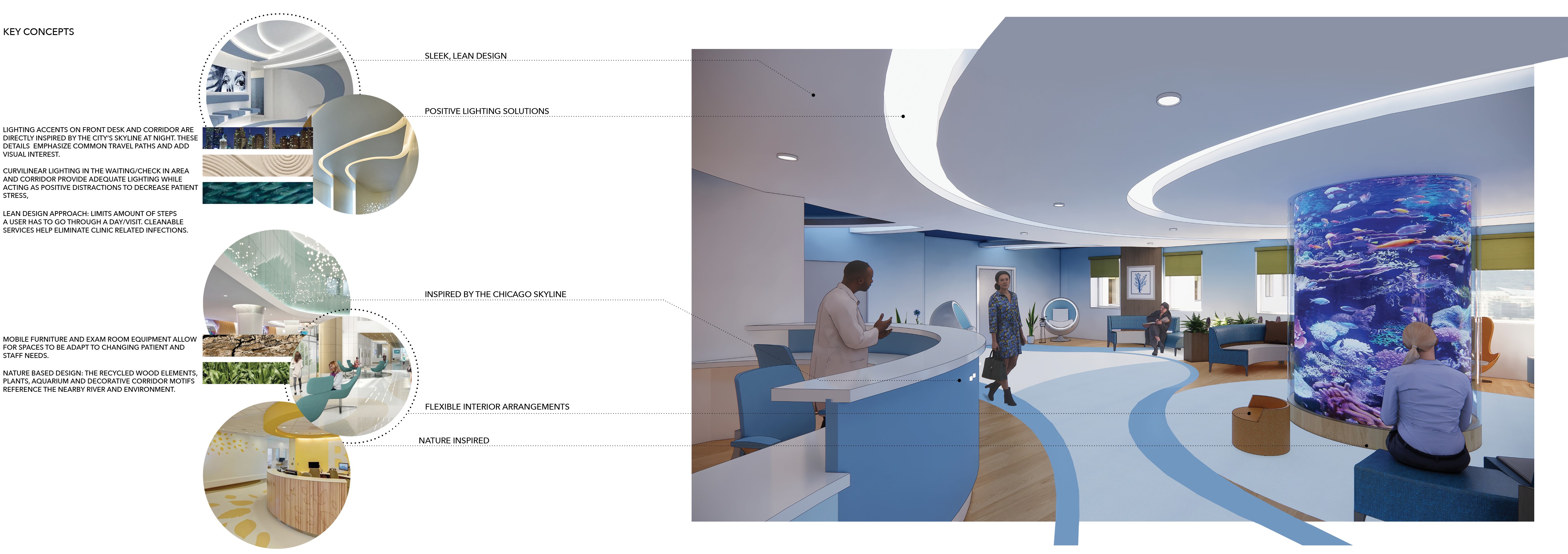 Riverside Clinic is a 5,900 square foot facility located on the 14th floor of a hypothetical Chicago skyscraper. The space is Northeast facing, so the clinic will experience sunrise in the waiting area while the exam rooms will experience more sun during the later part of the day.